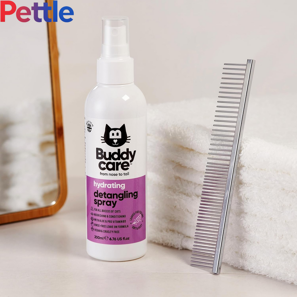Buddycare Cat Detangling Spray has a rinse-free leave-on formula. Just spritz of our nourishing and conditioning detangling spray will leave your cat's fur as soft as a feather, while the aloe and pro-vitamin B5 helps to soothe and protect your cat's coat.