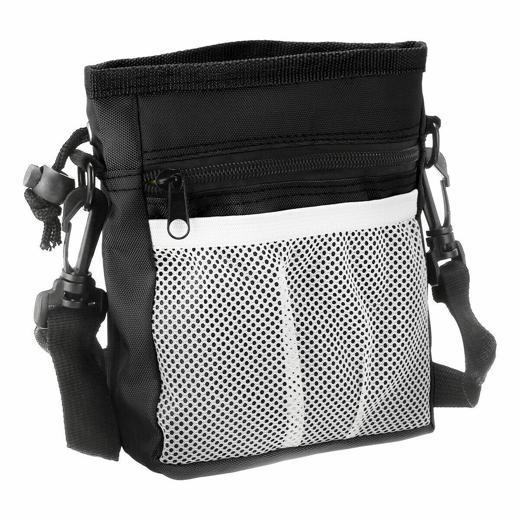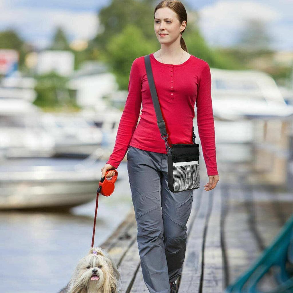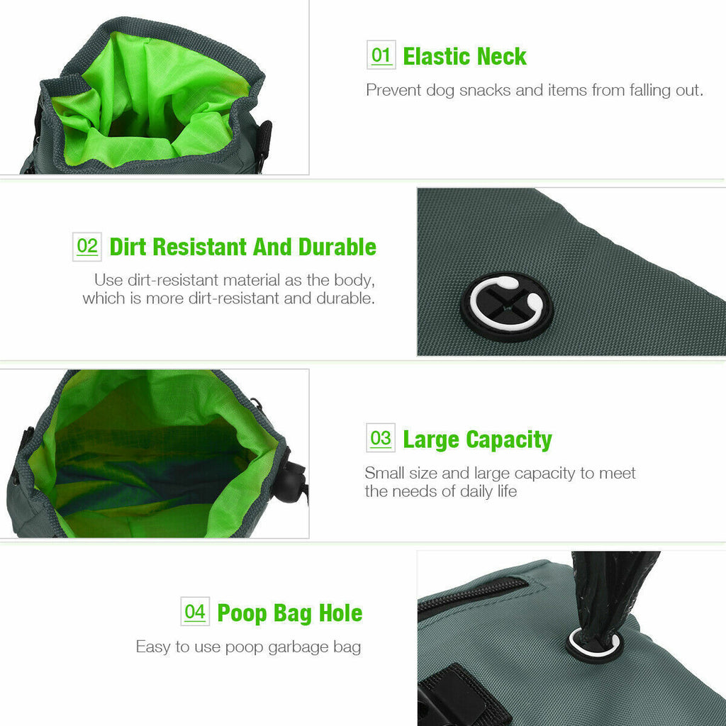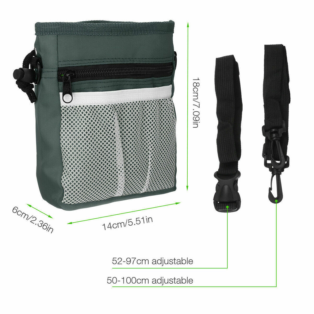 Product Features Easy to Store Kibble, Toys & Treats: The convenient drawstring securely holds in generous amounts of dog training treats, accessories, and dog toys. Perfect for training or walking the dog. Keeps You Prepared: You'll love the convenient dog poop bag, your dog waste bag is ready right when you need them. 3 Easy Ways to Wear: Choose to wear using the removable adjustable waistband, removable shoulder strap, or strong metal belt clip. Made of lightweight canvas material that keeps your dog treats dry while on those fun early morning walks with your doggy. Store Your Stuff: Safely store your smartphone, money, or keys in the two zippered pouches or front mesh netting while taking a stroll with your doggie. This ultimate dog treat bag has it all!